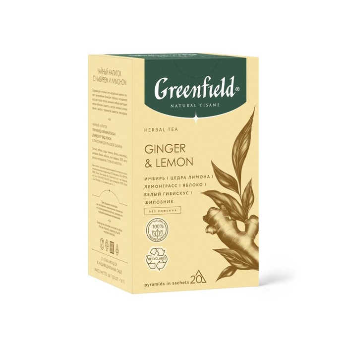 Чай Гринфилд Нейчерал Тизан Джинджер энд Лемон имбирь лимон травяной, 20пирам*1,8г