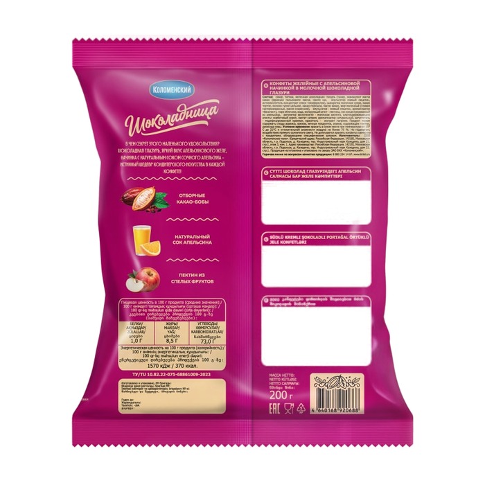 Конфеты Коломенское с апельсиновой начинкой в молочном шоколаде — это вкусное лакомство весом 200 г. Эти желейные конфеты покрыты нежной молочной шоколадной глазурью, что делает их идеальным десертом для любителей сладкого.Подробнее