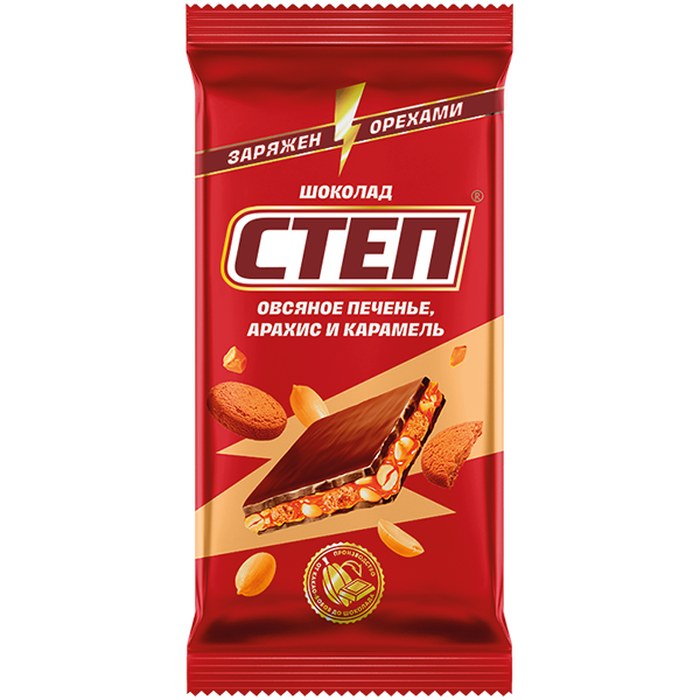 Шоколад молочный Степ с овсяным печеньем арахисом и карамелью, 80 г