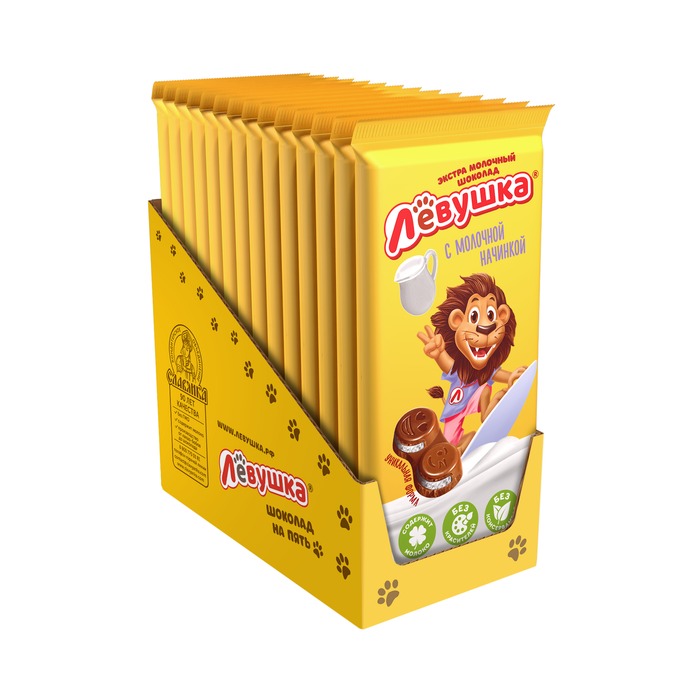 Молочный шоколад Славянка «Левушка» Экстрамолочный — плитка весом 85 г с повышенным содержанием молока. Изготовлен из какао-бобов, какао-масла и сухого молока с добавлением молочной начинки. Нежная консистенция и сливочный вкус делают шоколад популярным среди детей и взрослых.Подробнее
