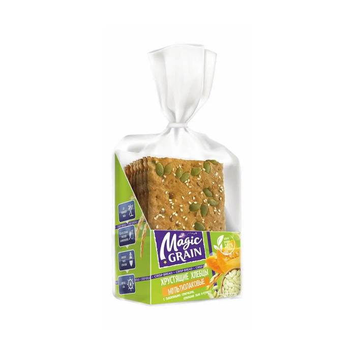 - Состав: мультизлаковые хлебцы, тыквенные семечки, семена льна, кунжут.