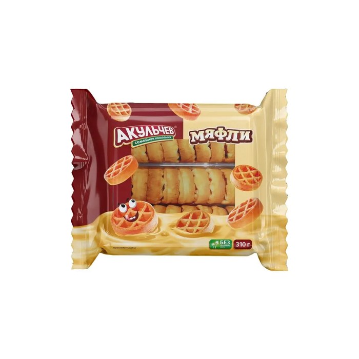 Мяфли от Акульчев — мягкие вафли нового формата с воздушной губчатой текстурой, не похожей ни на традиционную хрустящую вафлю, ни на обычное печенье. Выпекаются из яичного теста на подсолнечном масле, без пальмового масла. Вкус — нейтральный молочно-сливочный, подходит к любым напиткам. Производитель — ООО «Акульчев ВТК», г. Елабуга, Татарстан.Подробнее
