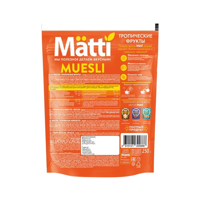 Мюсли Матти Тропические Фрукты — это не только вкусно, но и полезно, что делает их отличным выбором для поддержания здорового образа жизни.