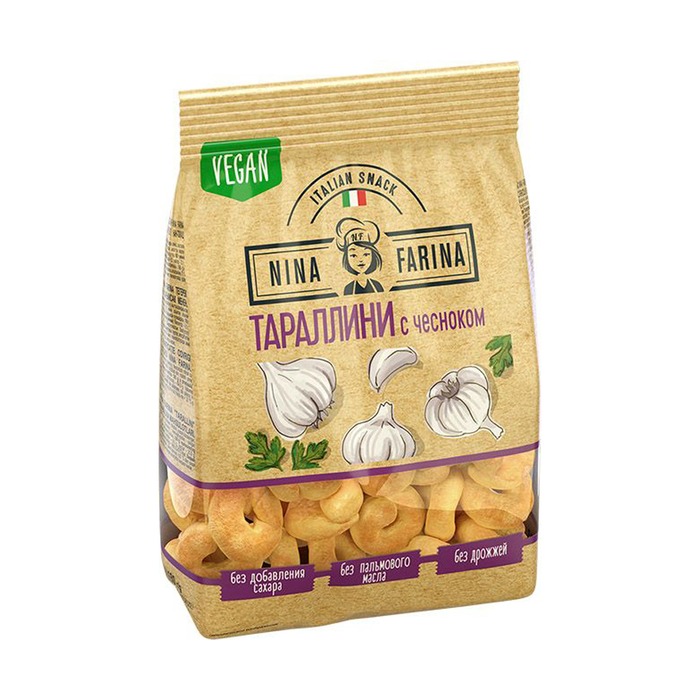 Тараллини КДВ Нина Фарина с чесноком — это отличный выбор для любителей хрустящих закусок с ярким вкусом.