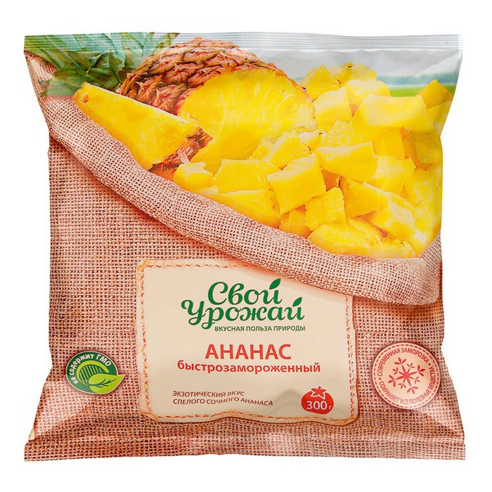 Ананас Свой урожай обладает насыщенным вкусом и ароматом, что делает его идеальным для приготовления десертов, салатов и смузи. Этот продукт сохраняет все полезные свойства свежего ананаса, благодаря бережной заморозке. Удобная упаковка позволяет легко хранить и использовать ананас в любое время.